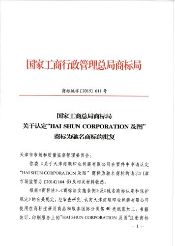 (海顺印业讯)日前, 海顺印业包装有限公司的注册商标“HAI SHUN CORPORATION (及图案)”被中国国家工商行政管理总局商标局认定为中国驰名商标。此次认定的成功不仅代表了海顺在印刷包装领域的影响力和领导力,同时也锻造了印刷包装行业的新传奇。