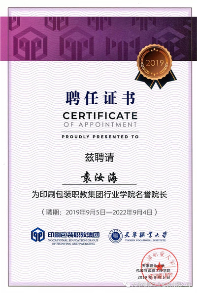 作为名誉院长,袁汝海书记将以天津职业大学为教学和科研基地,发挥天津印刷技术协会和企业的资源优势,深化产教融合、校企合作,推动企业深度参与协同育人,让更多的行业职工参加职业教育,搭建行业性、多元化、立体化、多层次的职业教育命运发展共同体,将其打造成特色鲜明的印刷包装职业教育品牌,为印刷包装业发展培养高素质技术技能人才,为促进职业教育发展及印刷包装业的转型升级做出贡献。