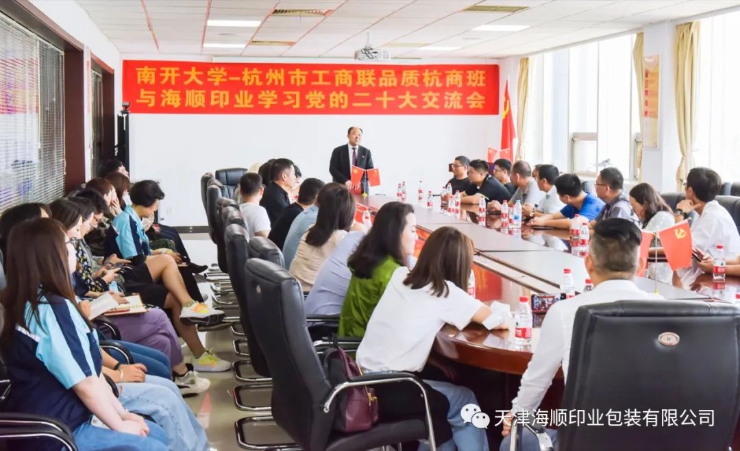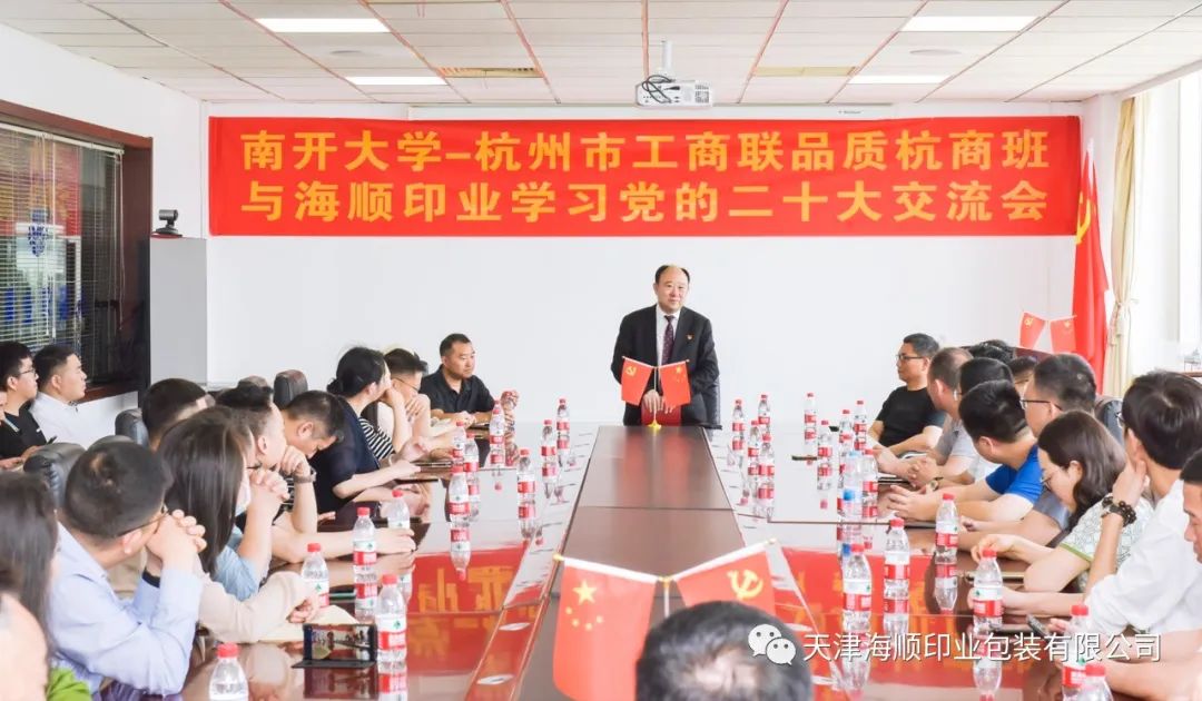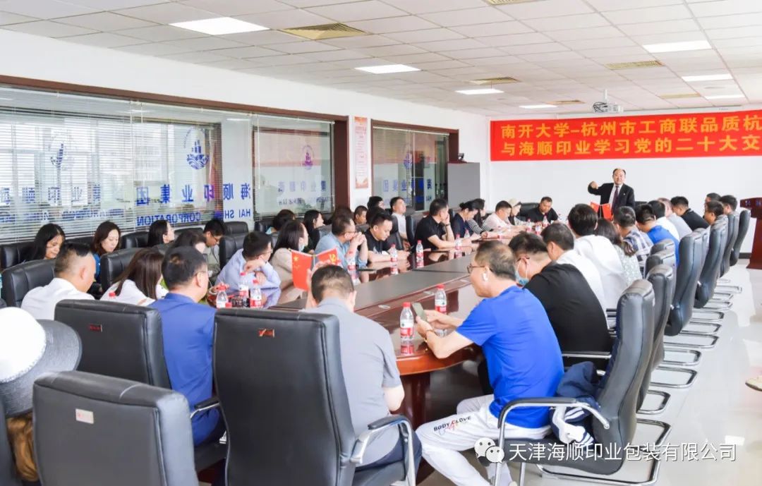 在全党上下深入开展学习贯彻习近平新时代中国特色社会主义思想主题教育之际,天津海顺印业包装有限公司(以下简称“海顺”)迎来了50余位正在南开大学研修班学习的杭州市工商联会员企业家代表团。代表团听海顺党支部书记袁汝海讲党课、参观现代化印刷车间,大家虽来自经济和社会发展遥遥领先于全国的富庶江南,但仍然为袁汝海书记的精彩创业故事以及对党的坚定信念和无限忠诚所深深吸引和感动,心逐热浪高,同样掀起学思践悟新思想的一股热潮。
